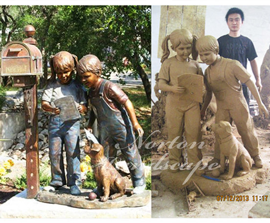 The latest production of bronze statues of little boys and dogs in Norton factory. The little boy wears a baseball bat on his head and a stool in