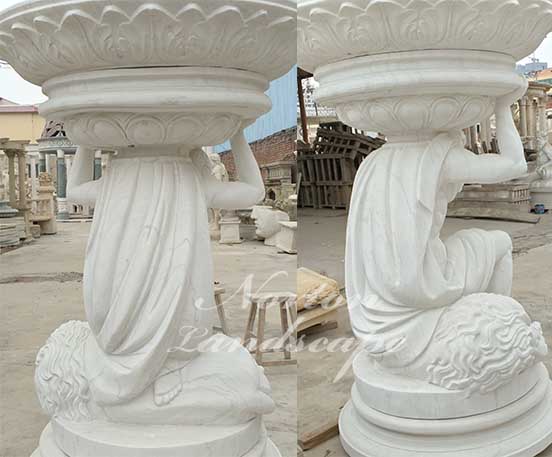 flower pots are composed of a man statue and a woman statue as the main body. The shape is that the statue is half kneeling against the flower pot. ,