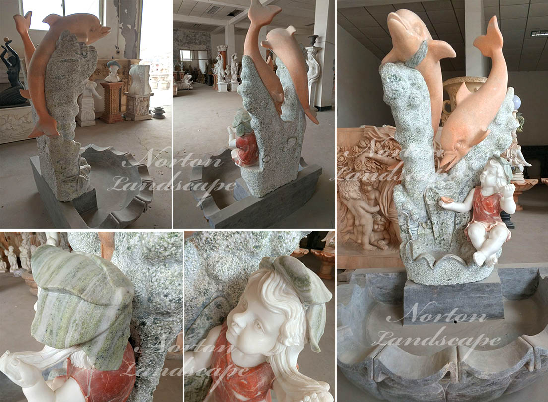 The Norton factory produces high-quality hand-carved colorful stone marble fountains with dolphin and little girl statues. This fountain is very